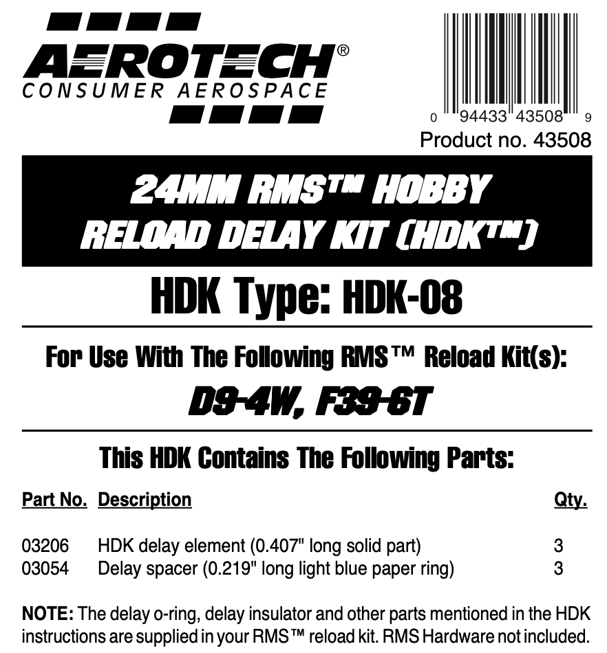 The AeroTech HDK-08 is for use with D9-4W (40904) and F39-6T (63906) motors. The motor hobby delay kit comes with 3 rocket delay elements and spacers. Motor delay O-rings, delay insulators and other parts are supplied with the RMS reload kits. Note that Hobby Delay Kits and High Power Delay Kits are not interchangeable.