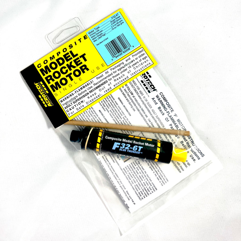 These high performance, composite propellant model rocket motors use the same family of solid propellant as NASA’s Space Shuttle Boosters, military missiles, sounding rockets, and NASA’s future SLS moon rocket. They utilize a patent pending high-strength polymer case and bulkhead, polymer nozzle and RCSs exclusive Blue Thunder™ aerospace grade composite propellant formulation, which produces a gorgeous bright violet-blue flame with a minimum of exhaust smoke. Blue Thunder™ motors provide a higher level of thrust than White Lightning™ motors of the same total impulse and are perfect for high lift-off acceleration.