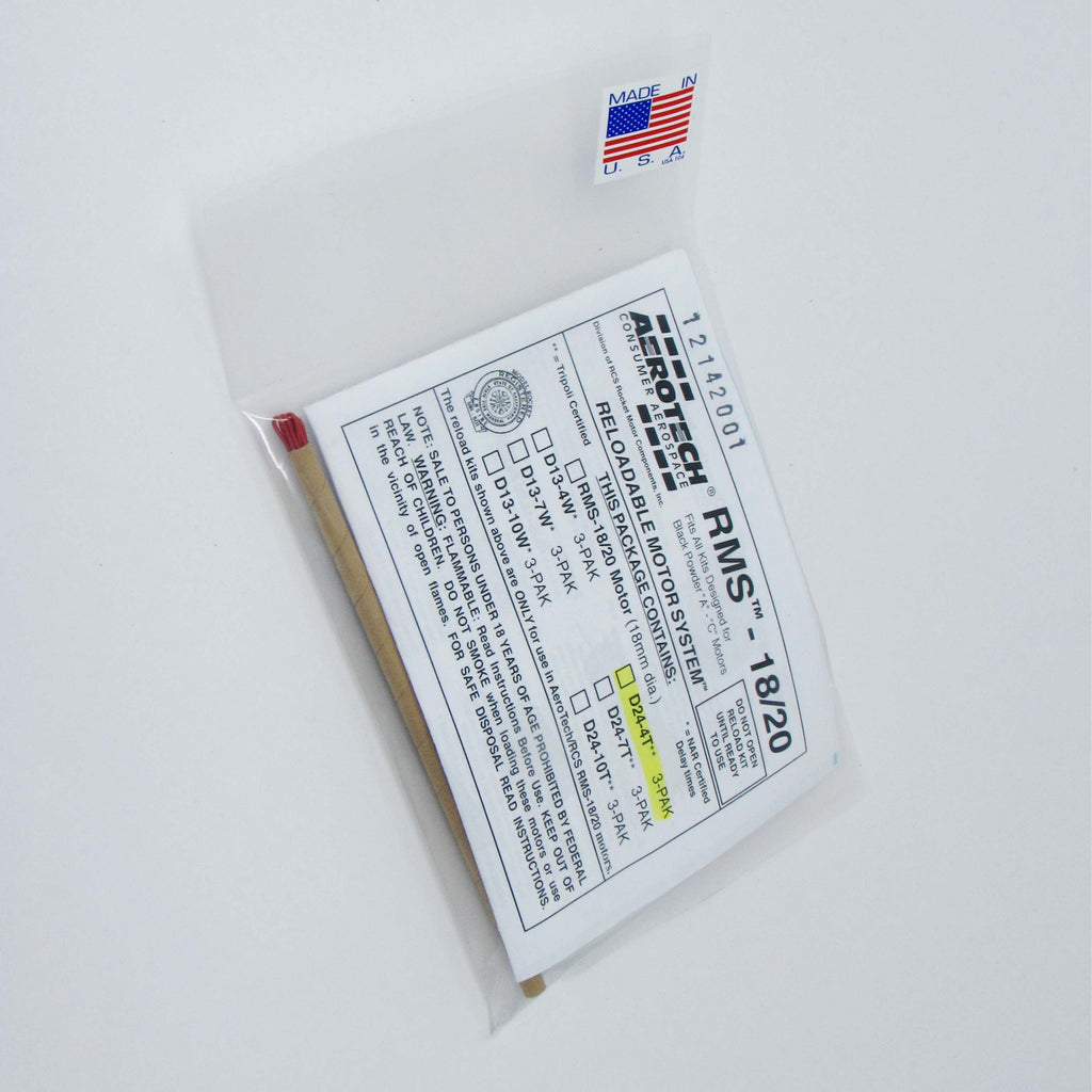 The AeroTech Reloadable Motor System RMS is an aluminum cased reusable motor in kit form that is assembled by the user. You will need AeroTech RMS-18/20 motor hardware to build and complete the motor for many reliable flights. Motor hardware is available separately in a complete set, and also as individual parts. Important: Mid Power RMS reload kits are not compatible with High Power RMS products. This RMS motor reload utilizes RCSs exclusive Blue Thunder™ aerospace grade composite propellant formulation, which produces a gorgeous bright violet-blue flame with a minimum of exhaust smoke. Blue Thunder™ motors provide a higher level of thrust than White Lightning™ motors of the same total impulse and are perfect for high lift-off acceleration.