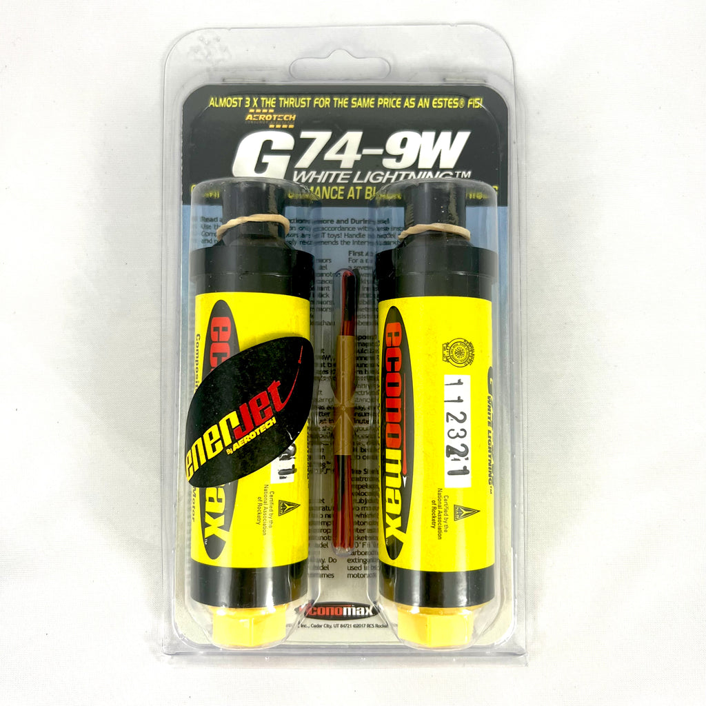 Enerjet G74-9W mid-power motors are single-use composite propellant model rocket motors. These high performance, composite propellant model rocket motors use the same family of solid propellant as NASA’s Space Shuttle Boosters, military missiles, sounding rockets, and NASA’s future SLS moon rocket. They utilize a patent pending high-strength polymer case and bulkhead, polymer nozzle and RCSs exclusive White Lightning™ aerospace grade composite propellant formulation, which produces a gorgeous bright white flame with lots of smoke and a throaty roar.