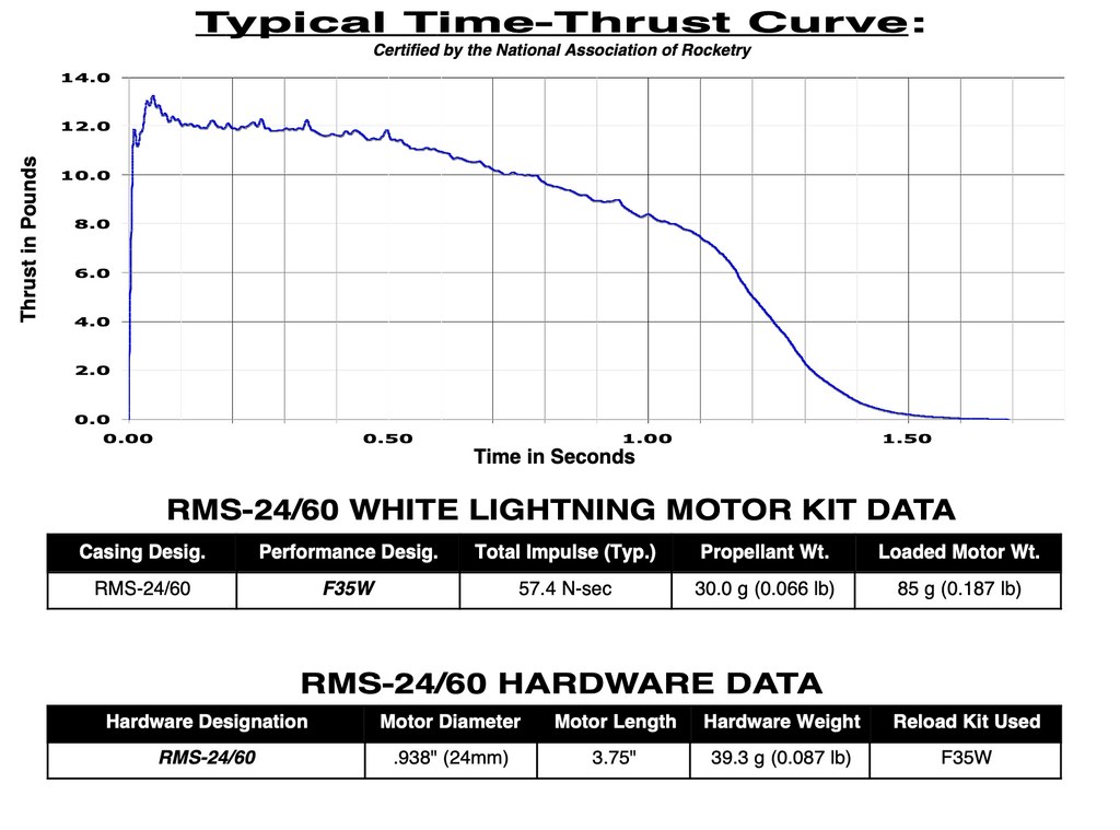 The AeroTech Reloadable Motor System RMS is an aluminum cased reusable motor in kit form that is assembled by the user. You will need AeroTech RMS-24/60 motor hardware to build and complete the motor for many reliable flights. Motor hardware is available separately in a complete set, and also as individual parts. Important: Mid Power RMS reload kits are not compatible with High Power RMS products. This RMS motor reload utilizes RCSs exclusive White Lightning™ aerospace grade composite propellant formulation, which produces a gorgeous bright white flame with lots of dense white smoke and a throaty roar at lift-off.