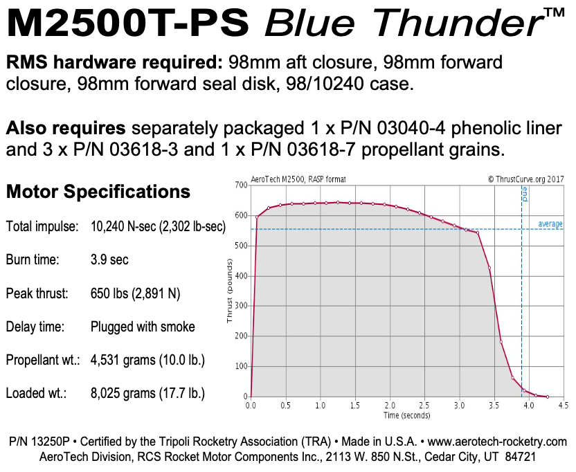 This RMS motor reload utilizes RCSs exclusive Blue Thunder™ aerospace grade composite propellant formulation, which produces a gorgeous bright violet-blue flame with a minimum of exhaust smoke. Blue Thunder™ motors provide a higher level of thrust than White Lightning™ motors of the same total impulse and are perfect for high lift-off acceleration.